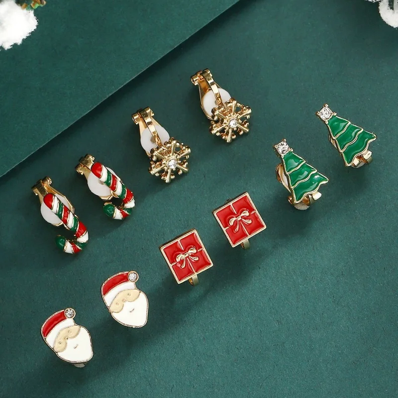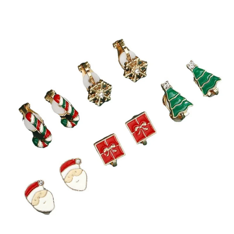 5 Pairs/Set Clip Earring for Women Small Cute Xmas Tree Snowflake Crutch Santa Claus